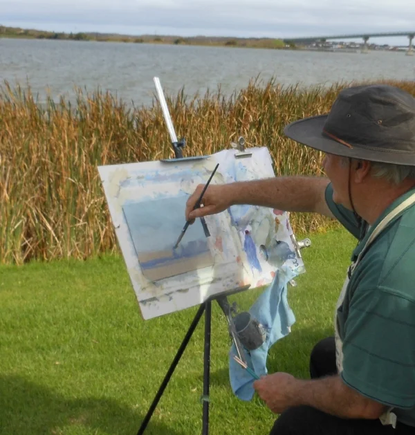Caption: Mike Barr plein air painting at Goolwa.